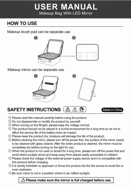 • Power Safety: Ensure the mirror is fully charged before use. Always check that your external charging device is compatible with the product voltage.